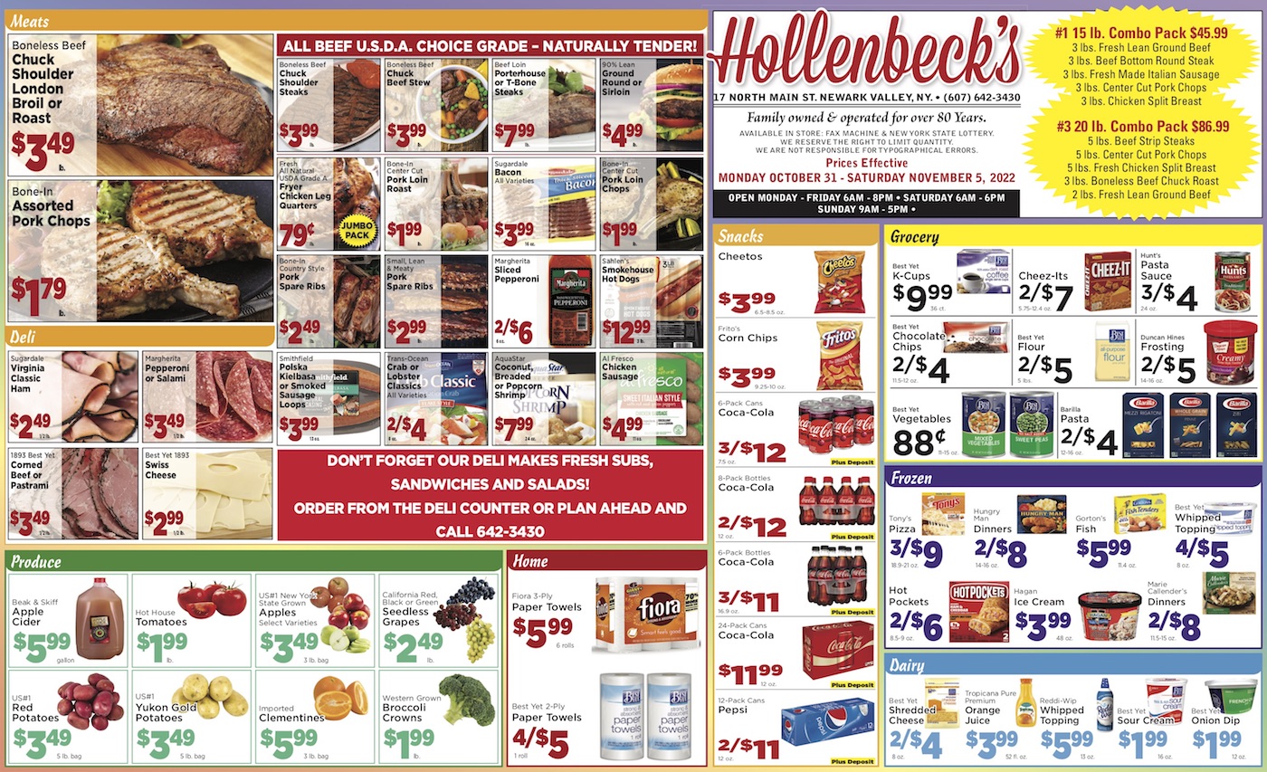 Hollenbeck’s of Newark Valley; specials for October 31 – November 5