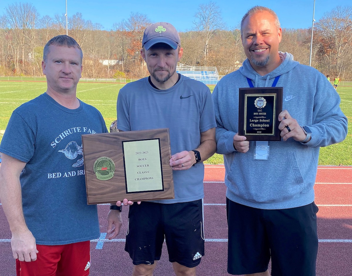 From left, SVEC coaches Gary Holmes, Jason Banks, and Adam Young pose with plaques acknowledging SVEC Boys Soccer as Class C champions and IAC Large School champions. Photo credit: Danielle Banks.