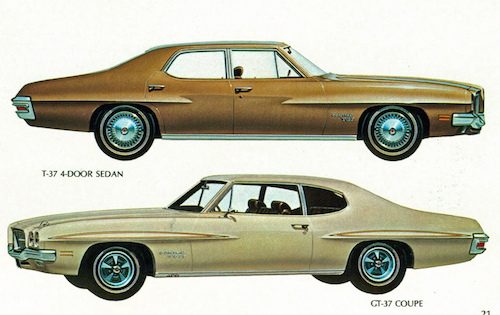 Pontiac released a T-37 and GT-37 model in 1970 and 1971. The T-37 was a Pontiac A-body trim midsize car that was a stripped down, low priced, Tempest. Meanwhile, and even though the GT-37 had the Ram Air III engine, no ram air hood was available and just 1,419 GT-37 coupes were built in 1970. A note here is that the GT option cost $236.97 and included Judge style accent stripes, Rally II wheels minus the trim rings, white letter tires, dual exhaust, 3-speed manual floor-mounted shifter, remote mirrors, hood pins, and the GT-37 nameplate.