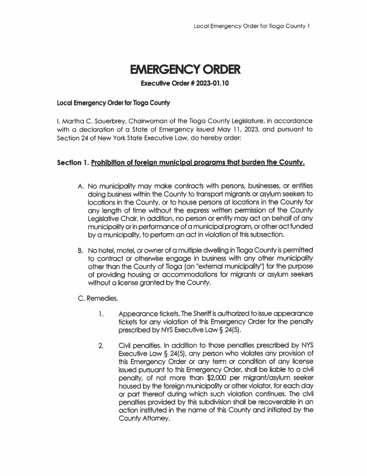 On June 29, 2023, Tioga County Legislative Chair Martha Sauerbrey extended the State of Emergency regarding the possible arrival of migrants or asylum seekers due to the national immigration crisis and the plans involving the relocation of migrants from New York City to other counties outside of New York City. The order, originally issued on May 11, is now extended until July 4, 2023.