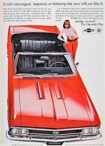 By 1966 the Chevelle grew in engine size to include a 396 with 325, 360 or 375 horses, much to the delight of the Chevy enthusiasts and boulevard cruisers. The 327 option was many times overlooked by performance buffs. (Chevrolet)