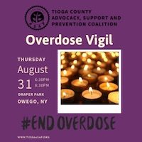 On Thursday, Aug. 31, the Tioga ASAP coalition will be holding its annual Overdose Vigil from 6:30-8:30 p.m. at Draper Park in Owego. If you are not familiar with what we do, please come check out the organization’s table, and listen to some of the speakers share their stories.