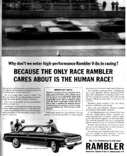 In 1964, AMC advertised it was against competing in organized auto racing, which turned out to be a big mistake as the muscle car craze began its spectacular boom years in ‘64. (Former AMC)