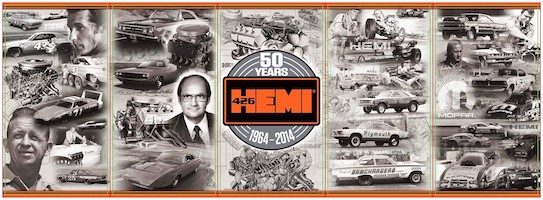A big celebration was held in 1994 celebrating 50 years of the Chrysler Hemi legacy. The late Tom Hoover, shown in the middle of this poster, receives much of the development credit for the 426 Hemi. Racers in the poster include, clockwise upper left, Richard Petty, Don Garlits, Dick Landy, Ronnie Sox, and Cotton Owens. (Chrysler Museum)