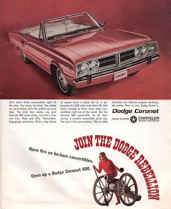 Here’s an ad for a 1966 Dodge Coronet mentioning the Hemi 426 availability. The 426 Hemi debuted as an off-road, race only addition back in 1964; but by 1966 Plymouth and Dodge offered the 426 Street Hemi as an option to allow use in the NASCAR races. (Dodge)