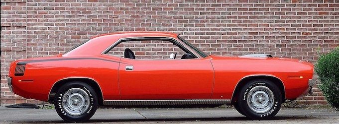 Similar in popularity is the 1970 Plymouth Cuda’ 426 Hemi, a sibling to the Challenger yet two inches shorter in wheelbase length than the Dodge. (Mecum Auctions)
