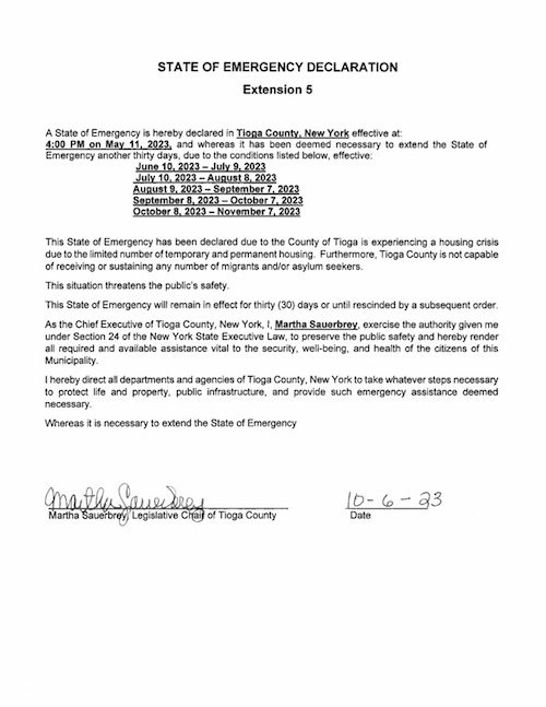 This State of Emergency has been declared due to the County of Tioga experiencing a housing crisis due to the limited number of temporary and permanent housing. According to Tioga County’s Legislative Chair, Martha Sauerbrey, Tioga County is not capable of receiving or sustaining any number of migrants and / or asylum seekers.
