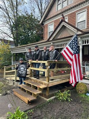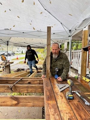 Punishers Apalachin New York Chapter (PANYC) work on a handicap ramp for their friend, Kevin Miller. (Photo by Wendy Post)