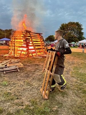 A firefighter keeps the bonfire going during Village Appreciation Night, held Oct. 6 at the Tioga County Fairgrounds in Owego. (Photo by Wendy Post)