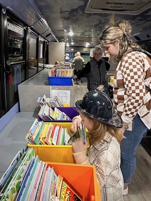 Youth browse through books at the Family Reading Partnership bus, parked at the event and open to youth during Village Appreciation Night, held Oct. 6 at the Tioga County Fairgrounds in Owego. (Photo by Wendy Post)