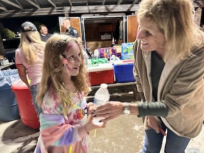 A volunteer offers a young guest, who was dressed festively for the event, a bottle of water during Village Appreciation Night, held Oct. 6 at the Tioga County Fairgrounds in Owego. (Photo by Wendy Post)