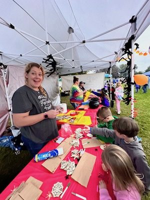 Brie, from Briezy Designs, helps children with their crafts during Village Appreciation Night, held Oct. 6 at the Tioga County Fairgrounds in Owego. (Photo by Wendy Post)