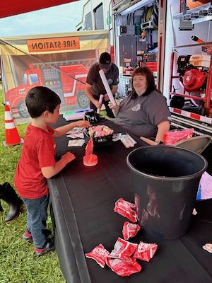 Guests enjoy giveaways by Owego’s Fire Department during the Oct. 6 Village Appreciation Night event, held at the Tioga County Fairgrounds in Owego. (Photo by Wendy Post)