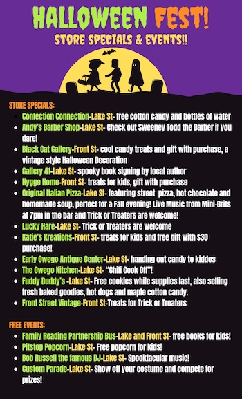 There will be plenty of Trick-or-Treating too! Collect sweet treats from local businesses and street vendors throughout downtown Owego. Select stores will also have some sweet deals for shoppers.