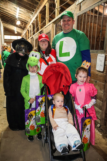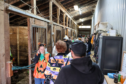The crowd of trick-or-treaters begins to form in the smaller of two barns. (Photo by Kenneth J. Waterhouse)