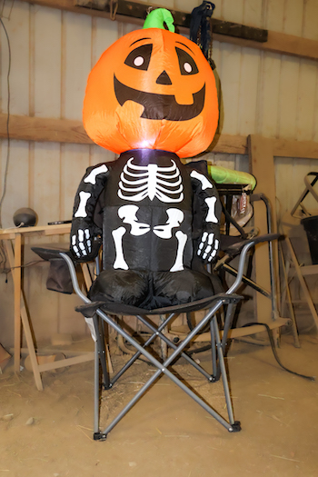 Watching over the games, held in the larger of the two barns, was this undead pumpkin / skeleton fellow resting comfortably in his camp chair. (Photo by Kenneth J. Waterhouse)