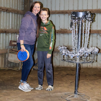 Mother and son try their hand at disk golf in the gaming area of the larger of two barns. (Photo by Kenneth J. Waterhouse)