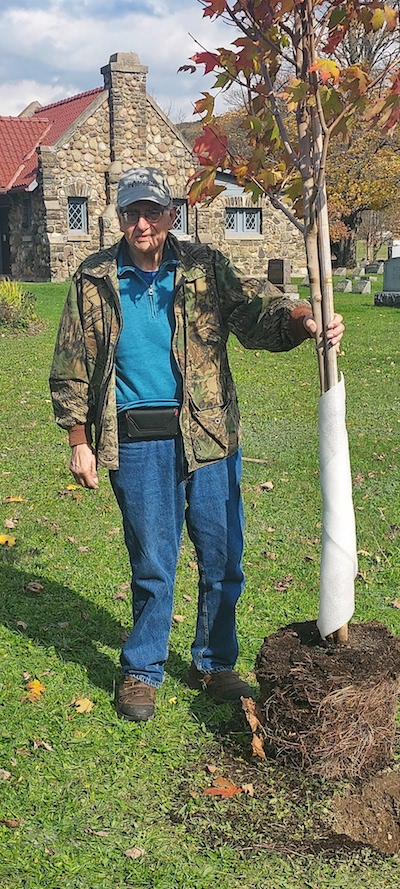 Dick Zavatto stands next to the Sugar Maple that was planted in his honor for his many community involvements by Candor Community Services. The tree was planted at the Candor Veterans Memorial, where he played a key role in its existence at Maple Grove Cemetery. (Photo by Carol A. Henry)