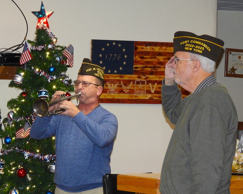 From left, Steve Palinosky performs the National Anthem at the Pearl Harbor Remembrance ceremony, held on Dec. 7 at the V.F.W. Post 1371 in Owego, N.Y. V.F.W. Honor Guard member Dean Morgan salutes. (JoAnn R. Walter Photo)