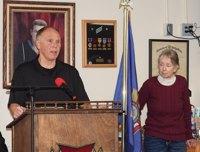 Bob and Jody Tatich, son-in-law and daughter of Pearl Harbor survivor Richard Hopkins, now deceased, speak at the annual Pearl Harbor Remembrance Day ceremony, held on Dec. 7 in Owego. (JoAnn R. Walter Photo)