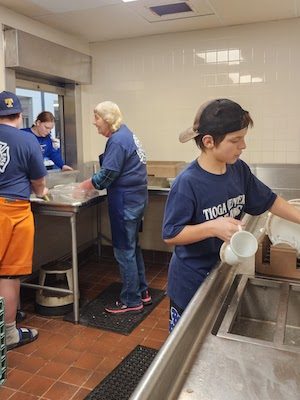 The community’s enthusiastic support was noticeable in every aspect of the event. Volunteers with Tioga Center Fire and EMS manned the grills in the school’s kitchen, supplying a steady stream of pancakes; and even their children helped out by washing dishes.