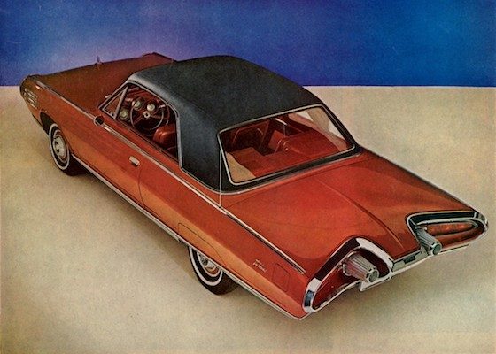 Introduced in 1963, the Chrysler Turbine Car, with its jet-like gas turbine engine, arrived for a unique test drive evaluation. The rear featured novel backup light “afterburners.” (Chrysler Corporation)