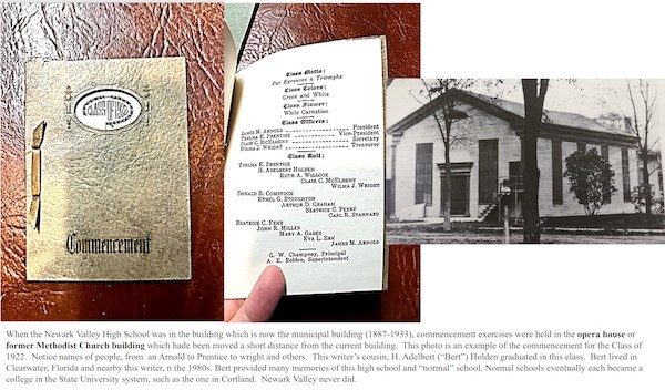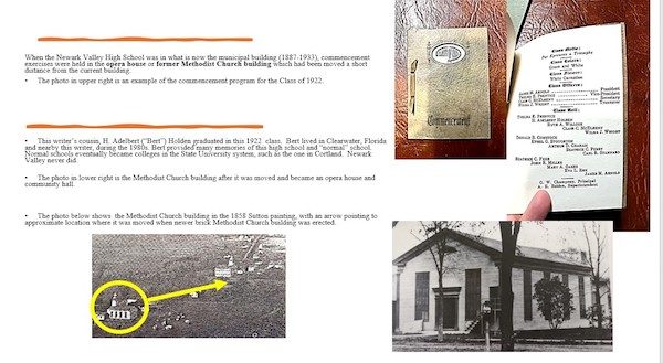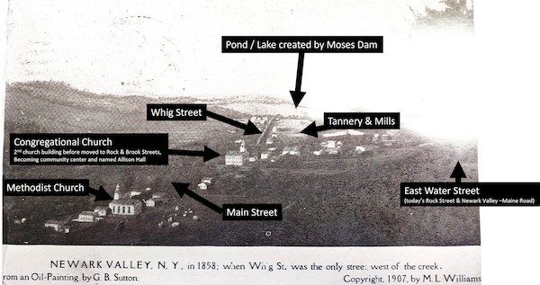 Amid Sutton’s other work, he created the 1858 painting of the Newark Valley landscape. The copy of the 1907 postcard with the painting is provided. Both the original and the post card with annotations made by the author of this article, about the streets, buildings, and historical notes regarding what existed in 1858, are provided with this article.