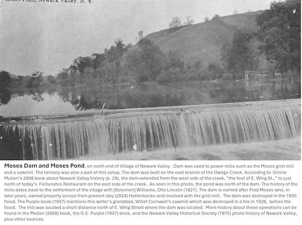This is a stark reminder of how Newark Valley, with ingenuity and hard work, developed over time into a bustling community. The community advanced from the near-wilderness conditions of 1858 to what we have today. In the accompanying photo, one will follow the path along Main Street, north of Water Street. The painting shows what was called the Moses Pond. The pond was a man-made one when the Moses Dam was built.