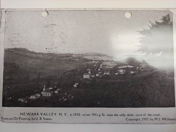 In 1858, Newark Valley artist and taxidermist, George Byron Sutton (1833-1901), painted a landscape view of Newark Valley as it existed at that time. From atop a hill on the southeast side of the village, Sutton gave us a depiction of the view of the village. This painting was displayed on a postcard in 1907.