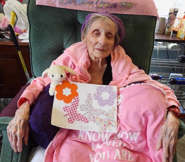 In her bright and spring-like decorated room, Clara’s favorite chair is graced with a ribbon that reads, “Birthday Queen.” A suitable title for the centenarian-plus one, Clara quipped that she is the oldest resident at Riverview today.