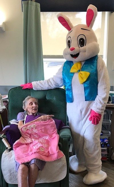 Clara Thurston Ross Bernard, a resident at Riverview in Owego, N.Y., a rehabilitation and nursing center, welcomed a special visitor to her room last week. Clara’s daughter, Kathy Cavano, remarked that Clara did not receive any candy, but loved the Easter Bunny visit! Clara will turn 101 on April 12. Provided photo.