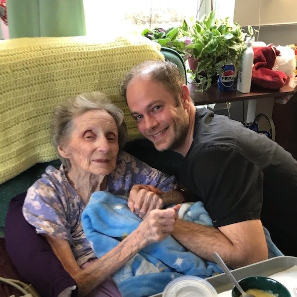 Clara Thurston Ross Bernard, a resident at Riverview in Owego, N.Y., a rehabilitation and nursing center, is pictured with John Hadix, a caregiver at the facility. The family is pleased with Clara’s care at Riverview, and daughter Kathy Cavano remarked that the staff is kind and wonderful. Provided photo.