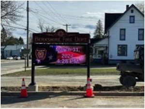 The Berkshire Fire District would like to update the community on the progress of fire protection in the Town of Berkshire. In the last year we have purchased a new pickup truck with the proceeds from the sale of our ambulance. The ambulance service was discontinued due to a lack of volunteers.