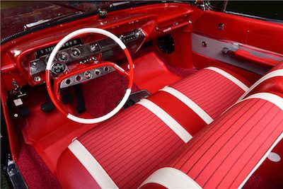 his 1961 Chevy Impala SS is a fine example of bench seat beauty back in the day. A most inviting interior, the bench allowed six passenger capacity, and, of course, easy access for a loved one to snuggle up close while cruising any avenue USA. (Barrett-Jackson)