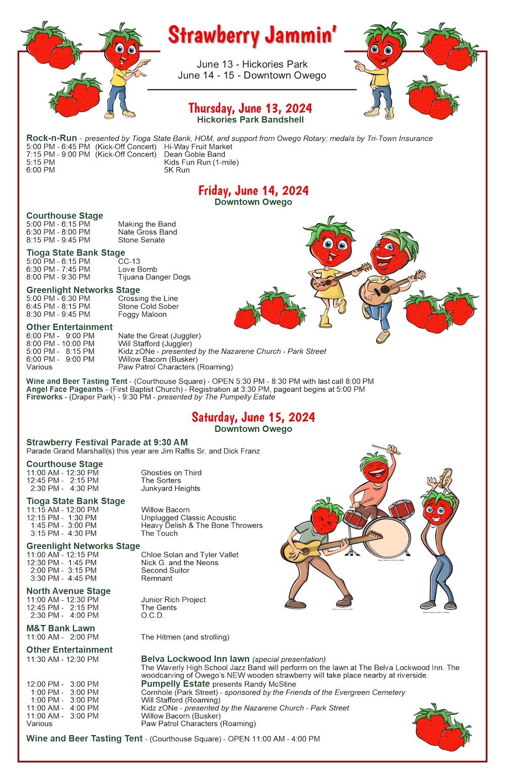 Other bands performing Saturday include Remnant, The Gents, and O.C.D. and many more. You can find the complete lineup of music by Following the Event Page “42nd Annual Strawberry Festival” on Facebook or at www.owego.org.