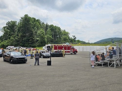 Students at the Tioga Central High School saw first-hand the dangers of distracted driving Wednesday afternoon during a mock accident program, organized by the school’s SADD club. The mock accident featured assistance from the Nichols and Tioga Fire Departments, State Trooper Shannon Hartzand, Tioga County Sheriff Jordan Zelesnikar, Sutfin’s Funeral Chapel, and coroner Ryan Kline. Students from the Tioga Central SADD club played the parts of crash victims with special effect make-up by Marley Bonacquist-Currin.