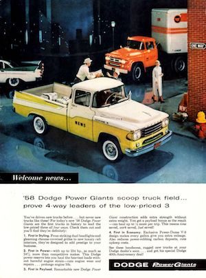 Advertisement for the 1958 Dodge Sweptside as a newspaper delivery pickup shows the big Dodge Tractor in the background. (Dodge)