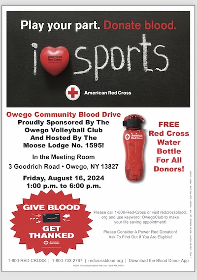 Owego Free Academy’s Volleyball team is joining efforts with the American Red Cross to host a blood drive, planned for Friday, Aug. 16, from 1-6 p.m. at the Owego Moose Lodge, located at 3 Goodrich Rd. in Owego. To donate, visit www.redcrossblood.org/give.html/donation-time.