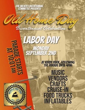 The Nichols Bicentennial Committee will offer a quilt raffle of a beautiful quilt contributed by the Nichols United Methodist Quilters. Tickets are $10 each. The quilt contains the Nichols Bicentennial Logo and photos of Nichols’ past. The drawing will be 3 p.m. at the Nichols Old Home Day.