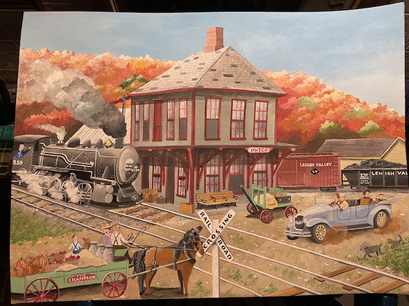 The Lehigh Valley Train Depot in the 1920s- In the early 1900s, Owego was a major railroad town and a central stopping point for passengers and freight along the Lehigh Valley’s Auburn Branch route from Lake Ontario on the mainline to Sayre. This painting features a bright, clear autumn day, with the hill ablaze with color, and families coming from near and far to board the train, ship their goods, or welcome someone to the village. The Depot, an iconic monument in the Flats, is brought to life as never before.
