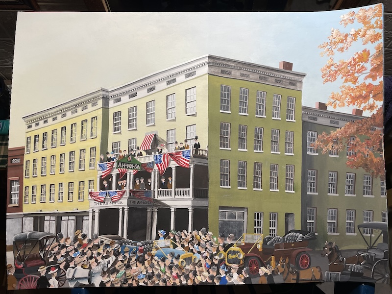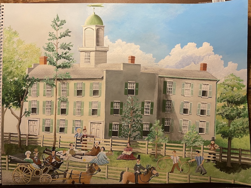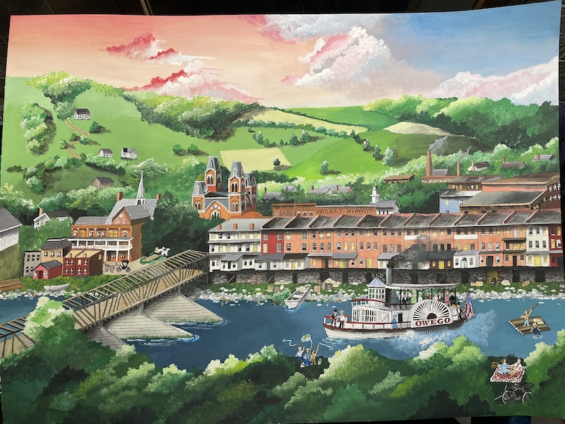 Being a local historian, artist, history teacher at OFA, and an advisor for the Class of 2025, I saw a special opportunity to combine my talent for painting, love for local history, and dedication to support our students and community. Over the course of the last six months, I have painted a series of Owego scenes, six in total, which will form the basis of an ongoing collective of local history paintings that will preserve Owego’s past and foster an appreciation for the stories of our village.