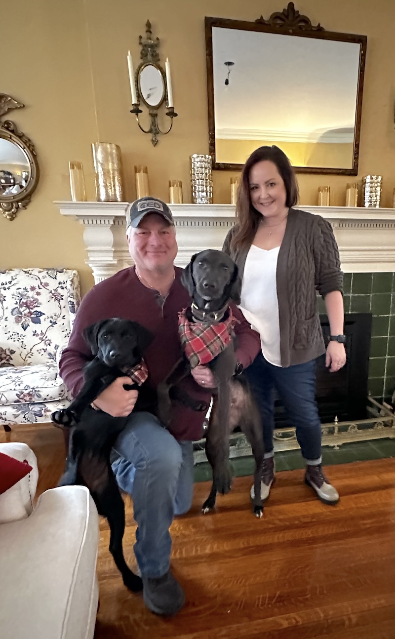 John and Stephanie Whitmore are pictured with Kai and Jinx at The Pumpelly Estate Bed and Breakfast on Front Street. The couple has made improvements to the air quality, landscaping, and amenities. (Photo by Wendy Post)