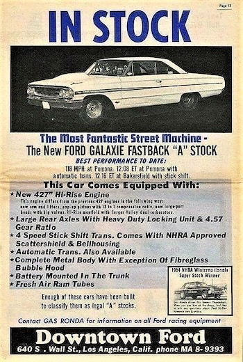 The attached ad for a 1964 Galaxie 427 Hi-Riser Special shows the drag car was based on the lighter weight option that Ford introduced in 1963. This option featured fiberglass body panels, aluminum bumpers, and other weight-saving ancillary items to lessen the car’s weight by about 300 pounds, or about three tenths less in quarter mile terms.