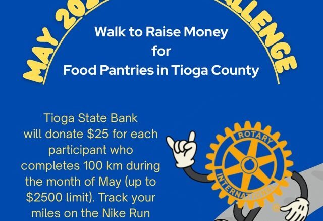 Walking is an easy and complete way to exercise and get health benefits. Food pantries are a first line of help for Tioga County residents who are food insecure. Tioga State Bank will donate $25 to local pantries for every walker who walks 100 kilometers in the month of May, up to a maximum of $2,500.