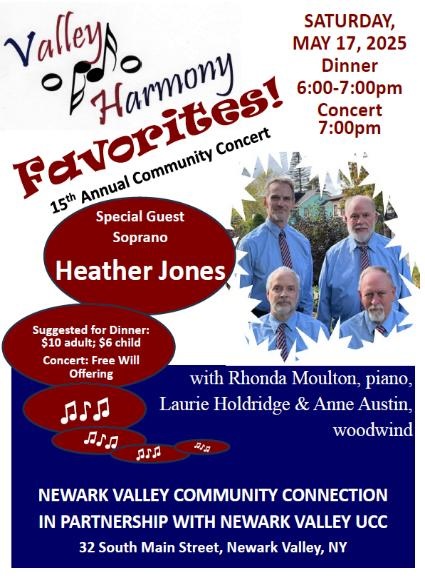 So come join Valley Harmony and their guests as they enchant you with lots of delightful favorites. Newark Valley Community Connection will offer a pasta dinner before the concert. Suggested prices for dinner are $10 adults and $6 children. A freewill offering will be accepted for the concert.