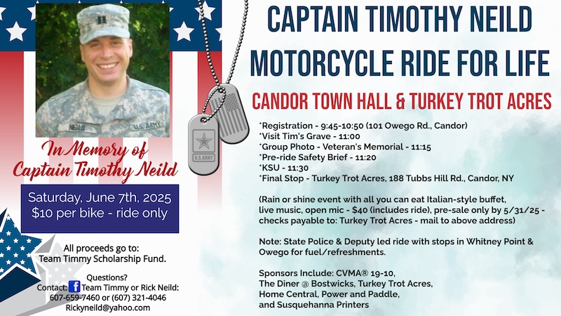 This year’s event will begin at the Candor Town Hall, located at 101 Owego Rd. in Candor, with registration and sign-in beginning at 9:30 a.m. There will be a ride dedication ceremony at Captain “Timmy” Neild’s gravesite at 11 a.m., followed by a group photo at Maple Grove Cemetery Veterans Memorial at 11:15 a.m.