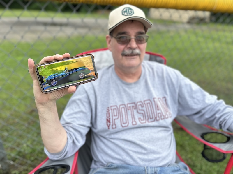 Former Waverly Mayor Patrick Ayres holds up a photo on his phone of a 1965 Midget, the first car that got him rolling in this hobby of sorts. Ayres brought his ‘72 MGB with overdrive to last Wednesday’s car show, hosted by Tioga State Bank at East Waverly Park. (Wendy Post photo)