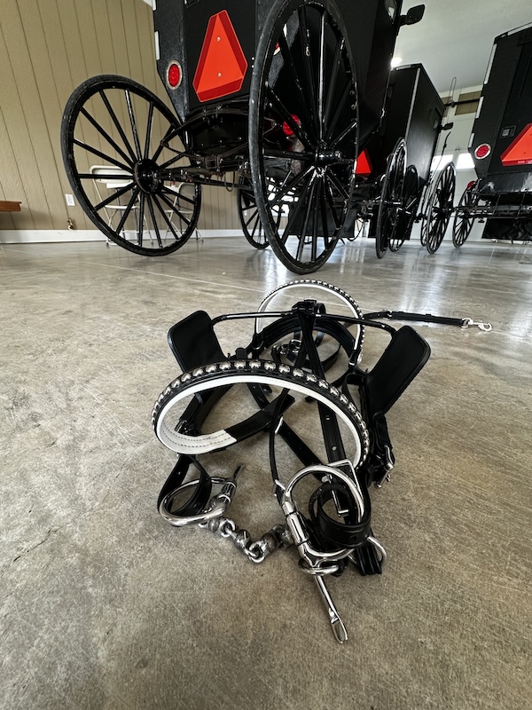 Inside the Amish barn at 371 Elmer Hill Rd. in Newark Valley are carriages and harnesses for the horses, a common mode of transportation. (Photo by Wendy Post)