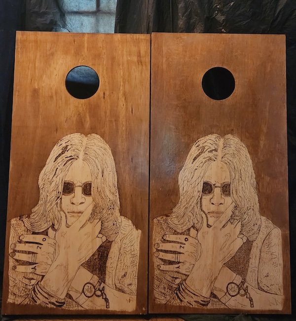 Miller donated a set of handcrafted cornhole boards for the event that features an iconic portrait of Ozzy on half-inch solid maple plywood. Miller invested about 40 hours of finely detailed handwork into the project and is pleased to see it will be raffled off for a good cause.