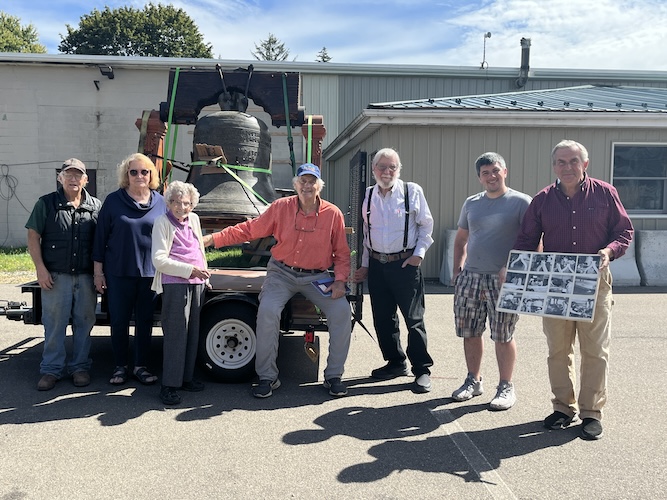 Bob Bassett, Vice President of the Charles H. Bassett Youth Foundation, along with Eudora Shuler, Village of Owego Trustee Fran VanHousen, and DPW’s Fred Ulrich, Tom McEnteer, and Phil and Sam Miele upon the bell’s delivery. (Photo by Sebby S. Truesdail)